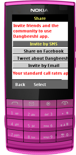 - To share and inform your friends and network of the Dangbeeshi app, click on the SHARE menu to share via SMS, Facebook, Twitter or Email.